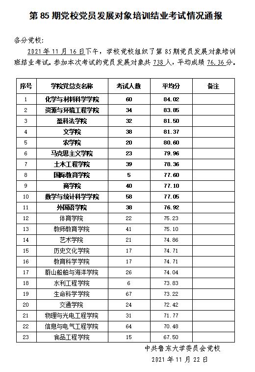 第85期党校党员发展对象培训结业考试情况通报